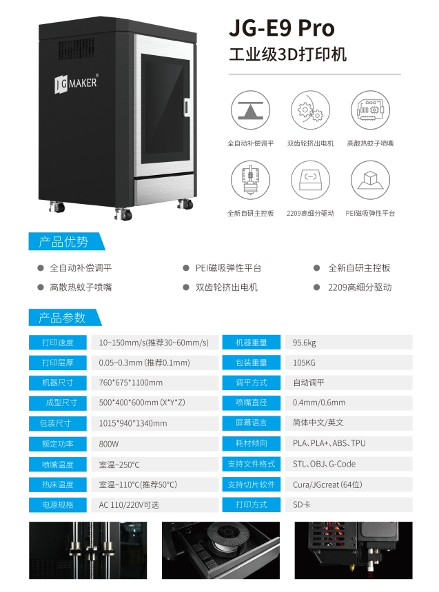 極光創(chuàng)新JG-E9 Pro作為極光創(chuàng)新工業(yè)級FDM系列3D打印機(jī)的王牌產(chǎn)品,在教育科研、工業(yè)制造等領(lǐng)域深受好評,除了擁有500*400*600mm的較大成型尺寸之外,全封閉空間的鈑金結(jié)構(gòu)機(jī)身,不僅可以很好的控制機(jī)箱溫度,有效提升打印精度。同時,該款機(jī)器的內(nèi)置配置也是直接拉滿,集成化設(shè)備管理系統(tǒng)、先進(jìn)的熱感控制系統(tǒng)、四軸靜音驅(qū)動主板、大流量高散熱蚊子噴頭等齊全的內(nèi)核配置,全方位保障3D打印模型的成型率。