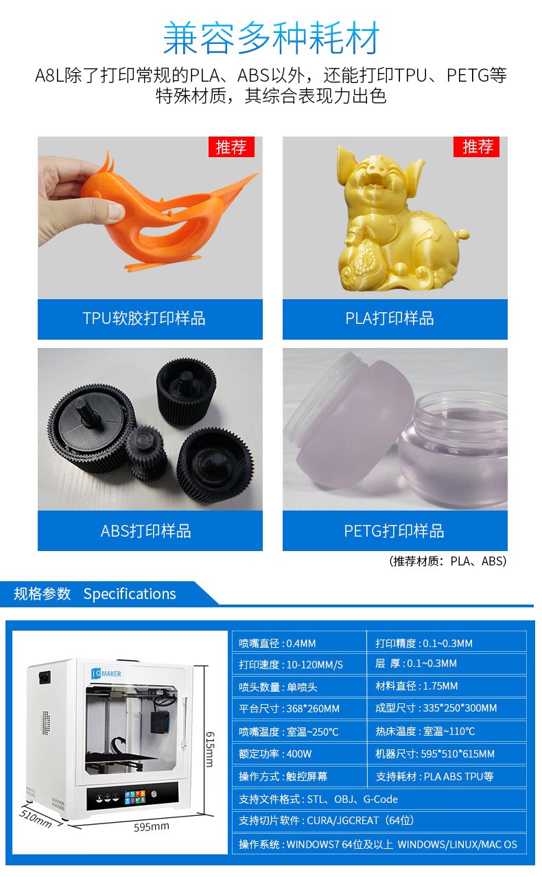 打印速度:30~120mm/s噴嘴直徑:標配0.4mm