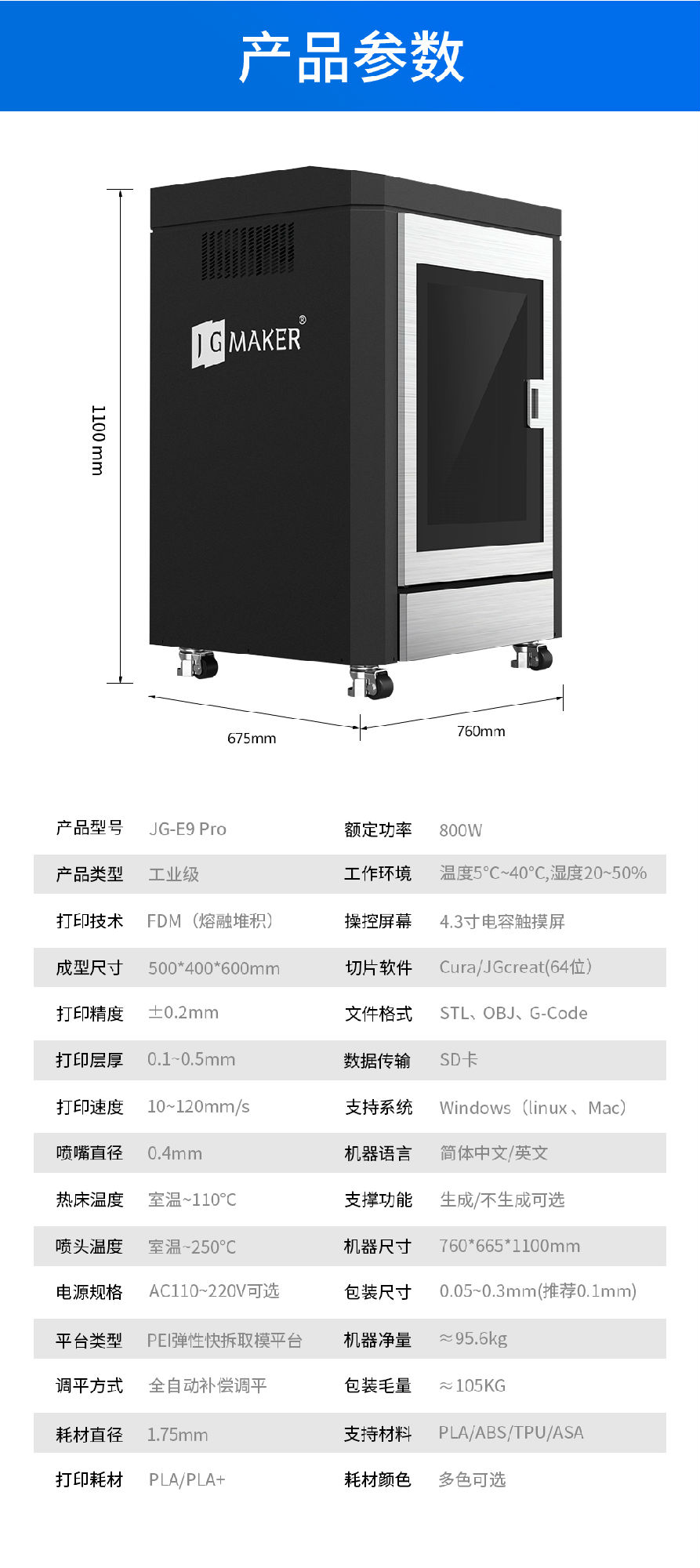 支持文件格式:STL, OBJ、 G-Code機(jī)器尺寸:760*665*1100mm